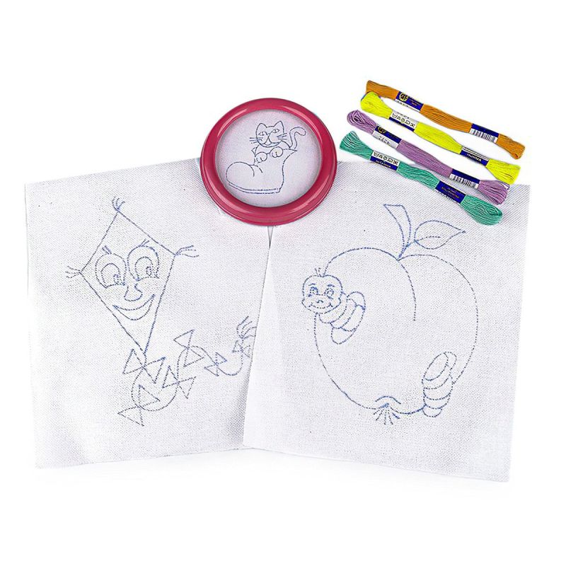 Dětská sada na vyšívání s motivem draka a jablka. Vyšívá se na předtištěnou tkaninu pomocí vyšívacích jehel a přízí mouline (mulinka). Vyšívací sada obsahuje vyšívací tkaninu s předlohou, sadu barevných přízí a kulatý plastový rámeček o průměru 12 cm (vnitřní průměr 9,3 cm) a dvě větší plátna ze 100% bavlny o rozměru 23 x 26 cm s předtištěnými motivy.