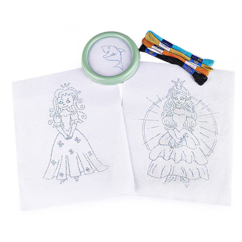 Dětská sada na vyšívání s motivem princezen. Vyšívá se na předtištěnou tkaninu pomocí vyšívacích jehel a přízí mouline (mulinka). Vyšívací sada obsahuje vyšívací tkaninu s předlohou, sadu barevných přízí a kulatý plastový rámeček o průměru 12 cm (vnitřní průměr 9,3 cm) a dvě větší plátna ze 100% bavlny o rozměru 23 x 26 cm s předtištěnými motivy.