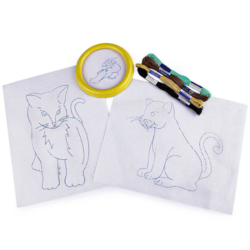 Dětská sada na vyšívání s motivem koček. Vyšívá se na předtištěnou tkaninu pomocí vyšívacích jehel a přízí mouline (mulinka). Vyšívací sada obsahuje vyšívací tkaninu s předlohou, sadu barevných přízí a kulatý plastový rámeček o průměru 12 cm (vnitřní průměr 9,3 cm) a dvě větší plátna ze 100% bavlny o rozměru 23 x 26 cm s předtištěnými motivy.