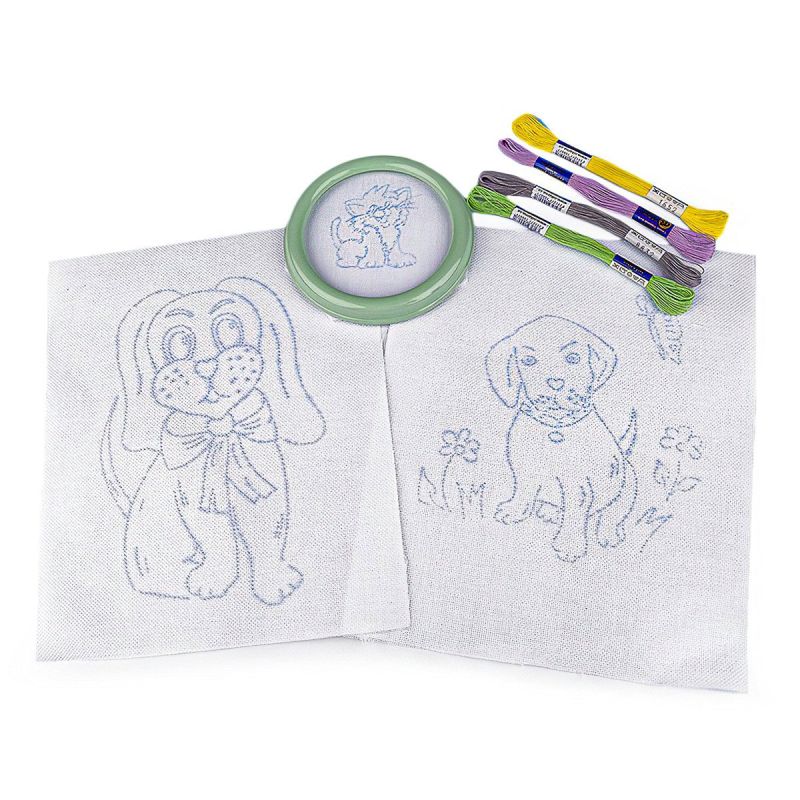 Dětská sada na vyšívání s motivem psů. Vyšívá se na předtištěnou tkaninu pomocí vyšívacích jehel a přízí mouline (mulinka). Vyšívací sada obsahuje vyšívací tkaninu s předlohou, sadu barevných přízí a kulatý plastový rámeček o průměru 12 cm (vnitřní průměr 9,3 cm) a dvě větší plátna ze 100% bavlny o rozměru 23 x 26 cm s předtištěnými motivy.