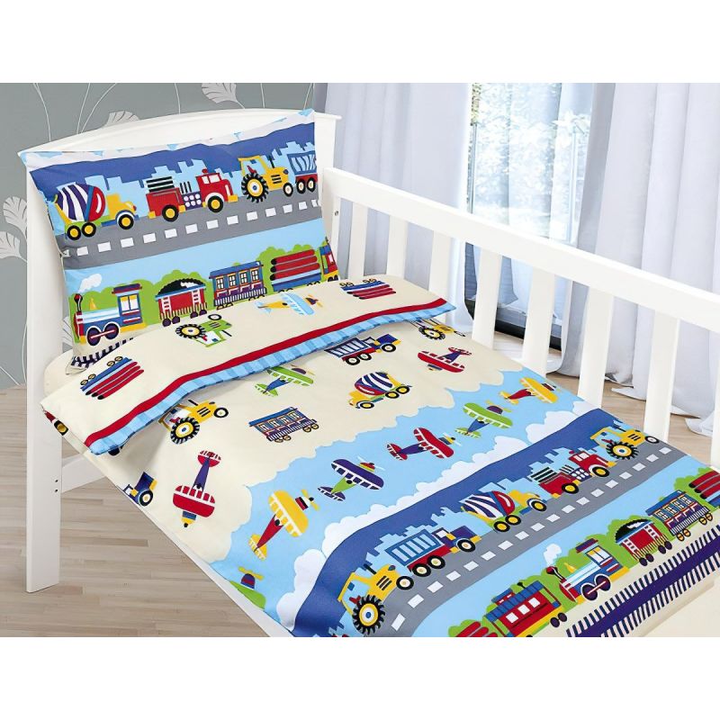 Dětské bavlněné povlečení do postýlky se vzorem autíček, letadel a vláčků na modrém a krémovém podkladu. Povlečení je z obou stran stejné. Souprava je...