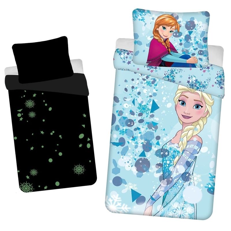 Dětské bavlněné povlečení z kolekce Jerry Fabrics s motivem hlavních hrdinů Anny a Elsy z pohádky Frozen 2 - Ledové království 2 na světle modrém podkladu. Povlečení je oboustranné. Z druhé strany je vzor vloček na světle modrém pozadí. Speciální svítivá vrstva způsobí, že některé části povlečení v noci hezky fosforekují Souprava je vyrobena ze 100% bavlny a obsahuje jeden povlak na přikrývku 140 x 200 cm a jeden povlak na polštář 70 x 90 cm. Zapínání na zip.