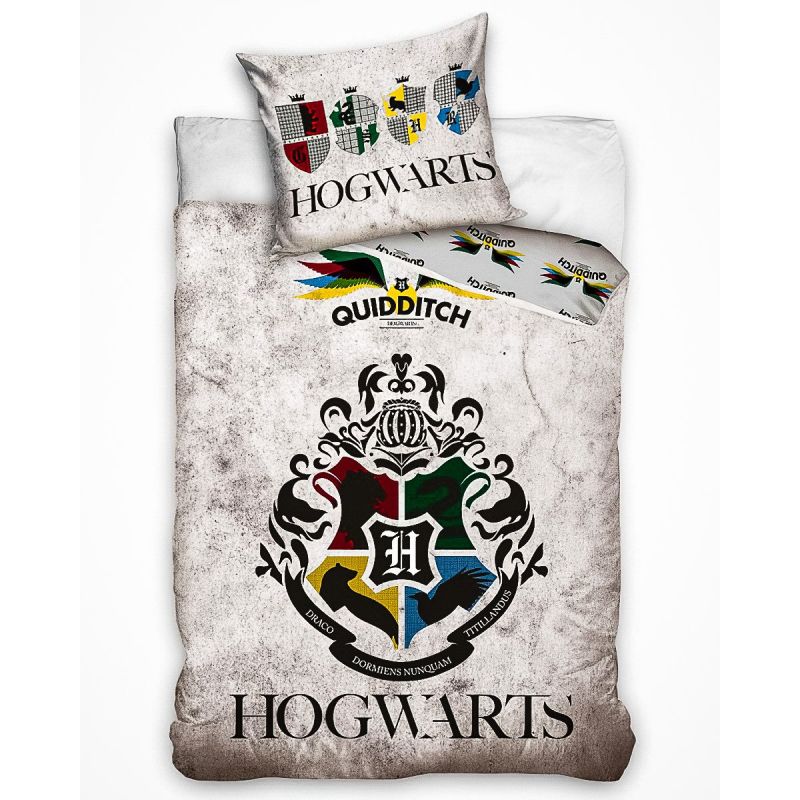 Dětské bavlněné povlečení s filmovým vzorem Harry Potter s logem Bradavické školy a erby všech čtyř týmů, které se účastní hry Famfrpál, v šedých odst...
