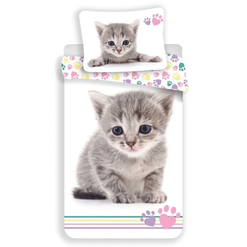 Bavlněné povlečení s roztomilým fototiskovým vzorem šedého koťátka na bílém podkladu. Povlečení je oboustranné, z druhé strany je bílé se vzorem kočičích tlapek. Souprava je vyrobena ze 100% bavlny a obsahuje jeden povlak na přikrývku 140 x 200 cm a jeden povlak na polštář 70 x 90 cm. Zapínání na zip.