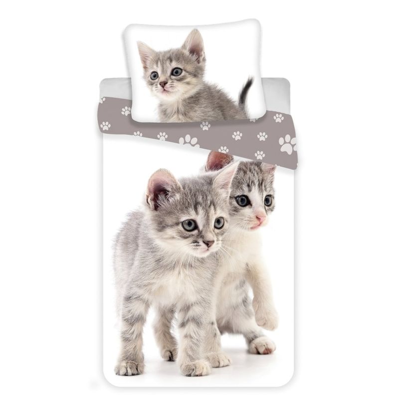 Bavlněné povlečení s roztomilým fototiskovým vzorem koťátek na bílém podkladu. Povlečení je oboustranné, z druhé strany je bílé se vzorem šedých kočič...