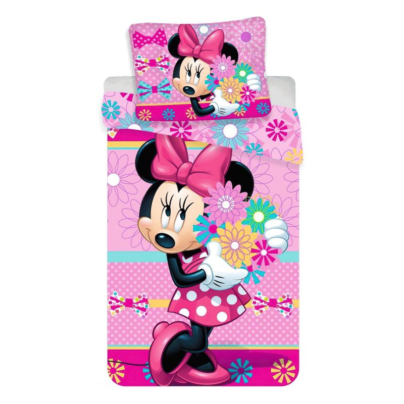 Dětské bavlněné povlečení s motivem pohádkové postavičky Minnie na růžovém podkladu. Povlečení s motivem pro holčičky je z každé strany jiné. Z jedné strany je Minnie květinami, zatímco na druhé straně jsou barevné květy na růžovém pozadí. Souprava je vyrobena ze 100% bavlny a obsahuje jeden povlak na přikrývku 140 x 200 cm a jeden povlak na polštář 70 x 90 cm. Zapínání na zip.