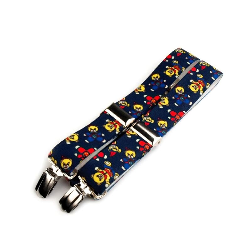 Dětské šle v tmavě modré barvě se vzorem medvídků s nastavitelnou délkou 60 cm, šíře 2,5cm v provedení ve tvaru písmene "Y" s uchycením na žabky.