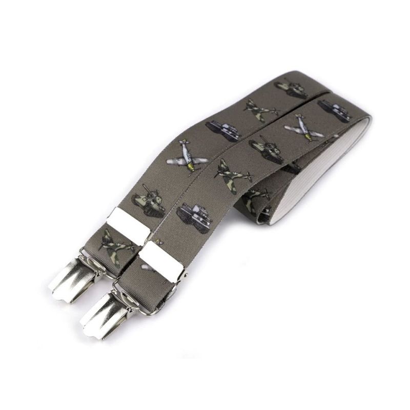 Dětské šle v khaki barvě s army vzorem tanků a letadel s nastavitelnou délkou 70 cm, šíře 2,5cm v provedení ve tvaru písmene "Y" s uchycením na žabky.