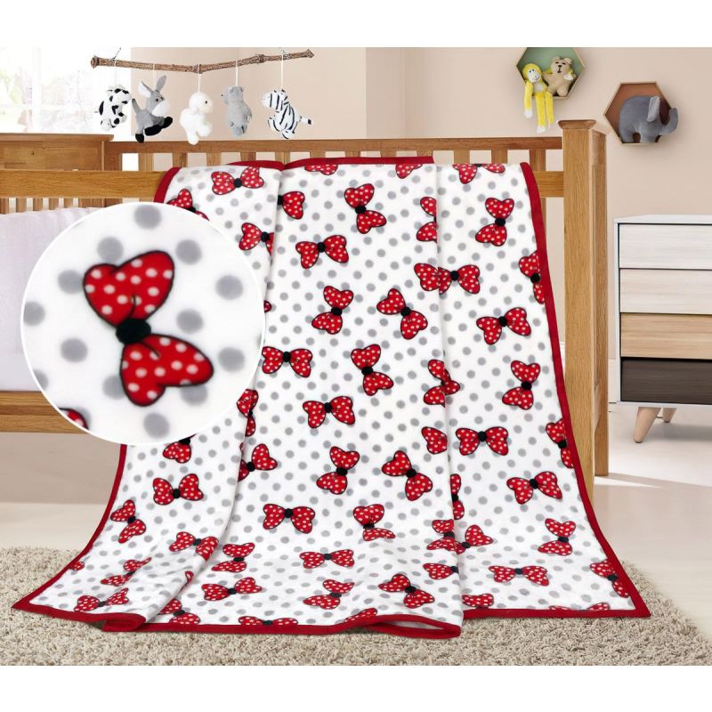 Neuvěřitelně hebká, jemná a sametová dětská deka ELLA z kolekce Korall micro s oboustranným vzorem červených mašlí na bílém podkladu s šedými puntíky ...
