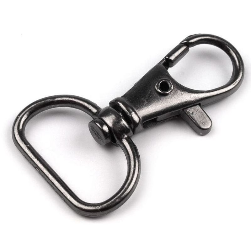 Kovová otočná karabina v niklové černé barvě, s rozměrem karabinky 12 x 30 mm a celkovou velikostí 24 x 42 mm, je vhodná na výrobu klíčenek a popruhů na menší tašky nebo kabelky. Můžete ji použít také na výrobu vodítek pro menší psy.