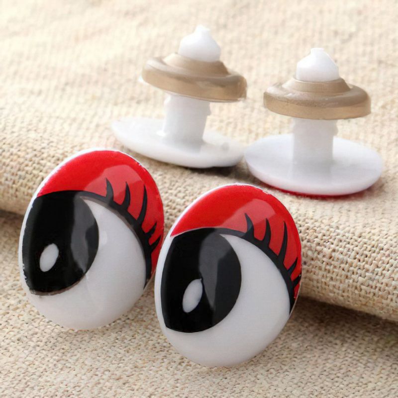 Bezpečnostní oči z tvrzeného plastu v rozměru 22x17mm s tištěným motivem očí, řas a obočí v červené barvě. Oči jsou vhodné pro výrobu hraček, dekorací a další doplňky. Díky bezpečnostní zarážce proti vypadnutí jsou oči odolnější vůči vytrhnutí nebo sloupnutí z výrobku. Cena je za 1ks včetně zarážky. Objednávat lze pouze jako pár (2ks).