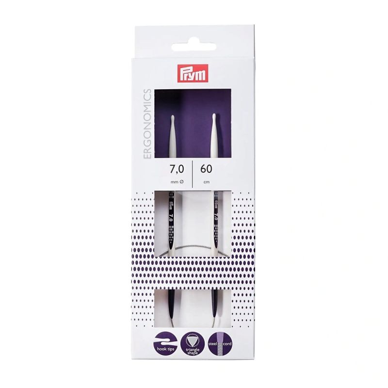 Revoluční pletací jehlice z vysoce funkčního syntetického materiálu německé firmy PRYM. Jehlice jsou ergonomické, velmi lehké a nehlučné. Špička ve tvaru kapky umožňuje jednodušší zachycení příze a hladké vedení jednotlivých ok, které je podpořeno i trojúhelníkovým profilem jehlice. Kruhové jehlice jsou spojeny ocelovým lankem potaženým plastem v délce 60cm a velikosti 7mm, které je pevné, ale zároveň i jemné a poddajné. Balení obsahuje 1 kus jehlic.