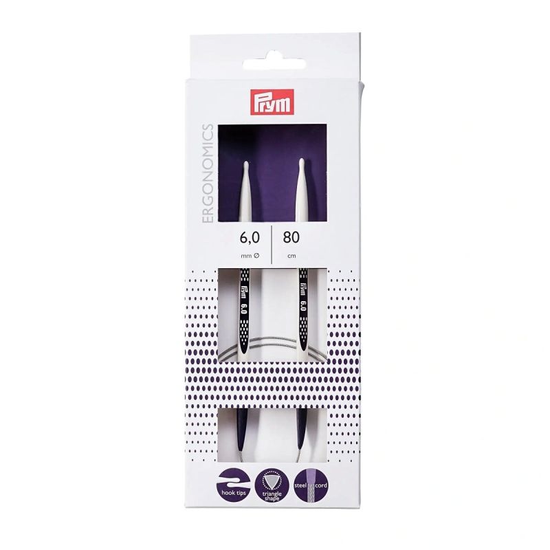 Revoluční pletací jehlice z vysoce funkčního syntetického materiálu německé firmy PRYM. Jehlice jsou ergonomické, velmi lehké a nehlučné. Špička ve tvaru kapky umožňuje jednodušší zachycení příze a hladké vedení jednotlivých ok, které je podpořeno i trojúhelníkovým profilem jehlice. Kruhové jehlice jsou spojeny ocelovým lankem potaženým plastem v délce 80cm a velikosti 6mm, které je pevné, ale zároveň i jemné a poddajné. Balení obsahuje 1 kus jehlic.