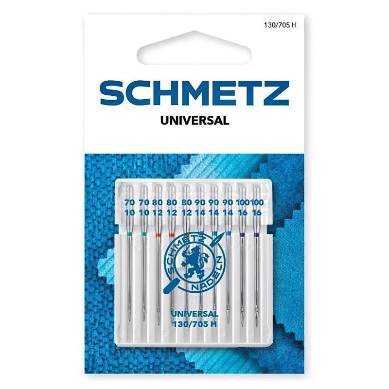 Univerzální strojové jehly Schmetz 130/705 H XCS, velikost 70-100. Vhodné pro domácí šicí stroje a pevnější tkaniny jako džínovina, plátno či silné ba...