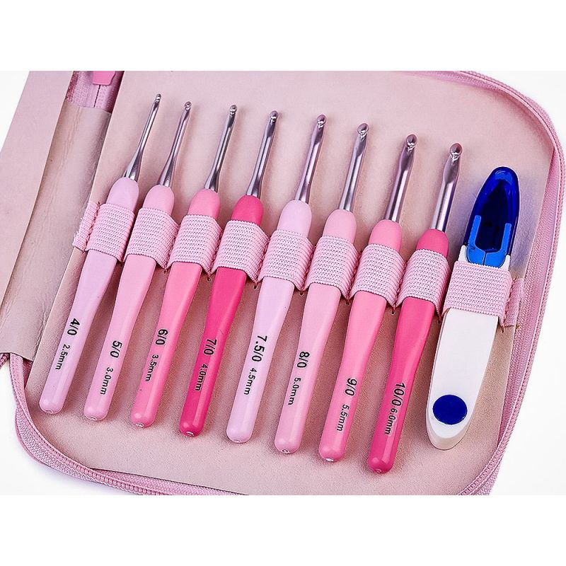 Sada hliníkových háčků na háčkování s plastovou rukojetí pro lepší uchopení v délce 13,7 cm. Souprava obsahuje 8 různobarevných háčků o velikostech 2,5; 3; 3,5; 4; 4,5; 5; 5,5; 6 mm + cvakačky (barvy se mohou lišit), vše v praktickém pouzdře se zipem. Háček s nejnižším číslem je nejslabší, s nejvyšším naopak nejsilnější. Doporučená velikost háčku je obvykle uvedena na obalu každé příze.