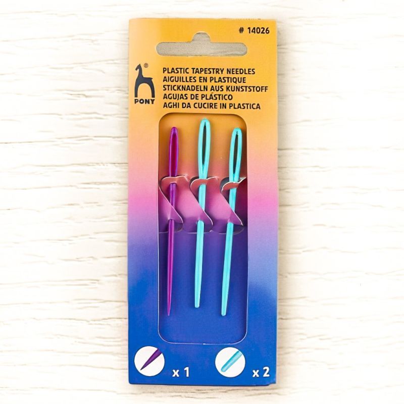 Sadu plastových jehel na sešívání pletených a háčkovaných výrobků či vyšívání aplikací. Jehly mají velká ucha pro snadné navlékání vlny. Souprava obsahuje 3 kusy jehel, 1 s ostrou špičkou a 2 s tupou špičkou.