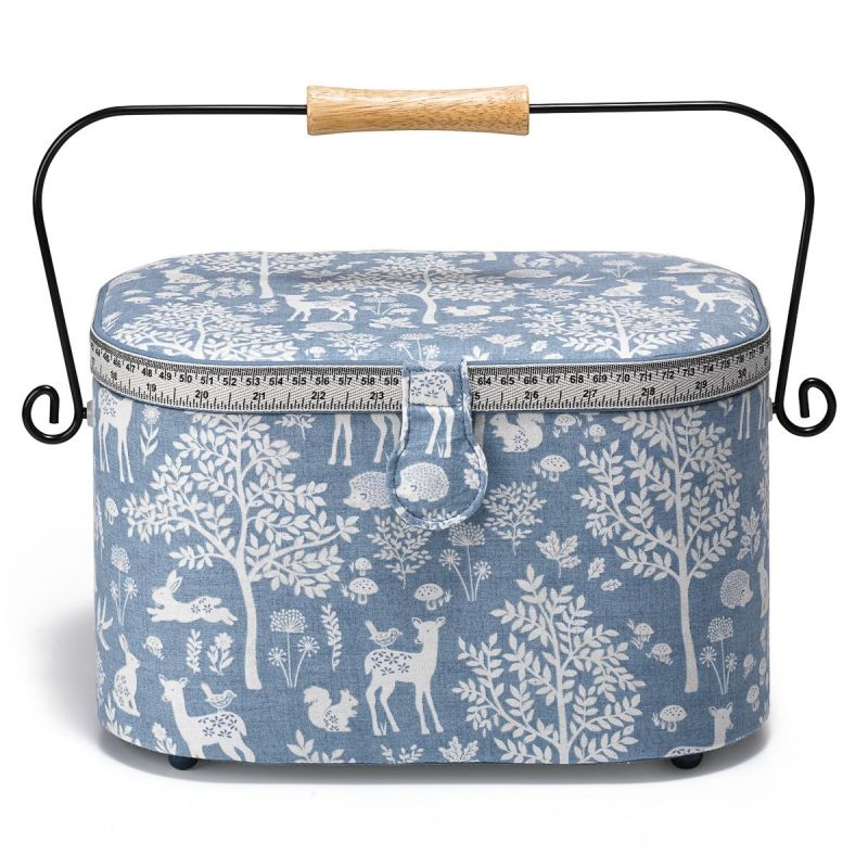 Kazeta / košík na šití, čalouněný, L WOODLAND, modrý les, 30 x 20 x 19cm