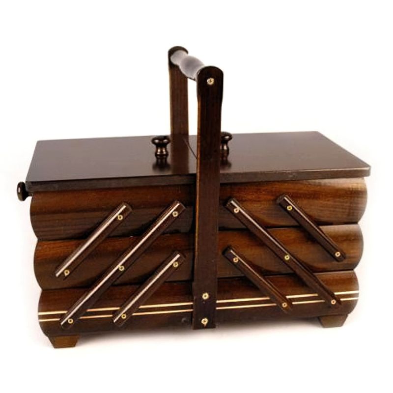 Dřevěná kazeta na uložení šicích potřeb v hnědém provedení. Košík na šití s praktickým uchem pro snadný přenos pojme nůžky, jehly, špendlíky, nitě, metry a další krejčovské potřeby. Rozkládací vnitřek obsahuje čtyři menší přihrádky po stranách a jednu velkou ve spodní části. Šitíčko je vyrobeno z lipového dřeva. Rozměry košíku jsou 15 cm x 30 cm a výška činí 25 cm (rozměry se měří včetně úchytek a středového ucha a mohou se cca o 1 - 1,5 cm lišit).