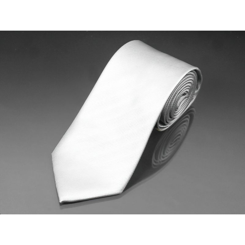 Pánská ručně šitá kravata AMJ v bílé barvě s jemným vroubkováním (ryps). Šířka 7,5 cm, délka 146 cm, materiál 100% polyester.
