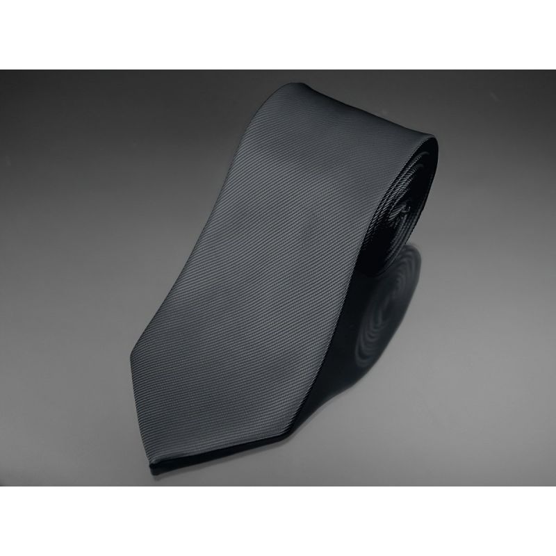Pánská ručně šitá kravata AMJ, tmavě šedá s jemným šikmým proužkem. Šířka 7,5 cm, délka 146 cm, materiál 100% polyester.