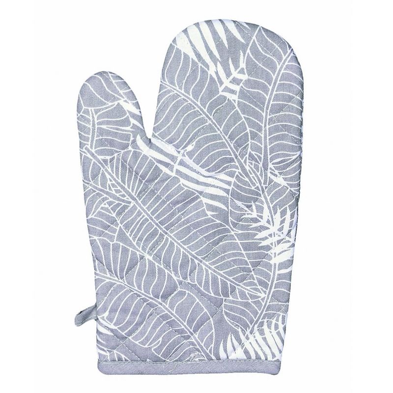 Kuchyňská chňapka (rukavice) se vzorem bílých květů listů na šedém podkladu. Chňapka má všité poutko na zavěšení. Chňapka je v rozměru 28x18cm a je vy...