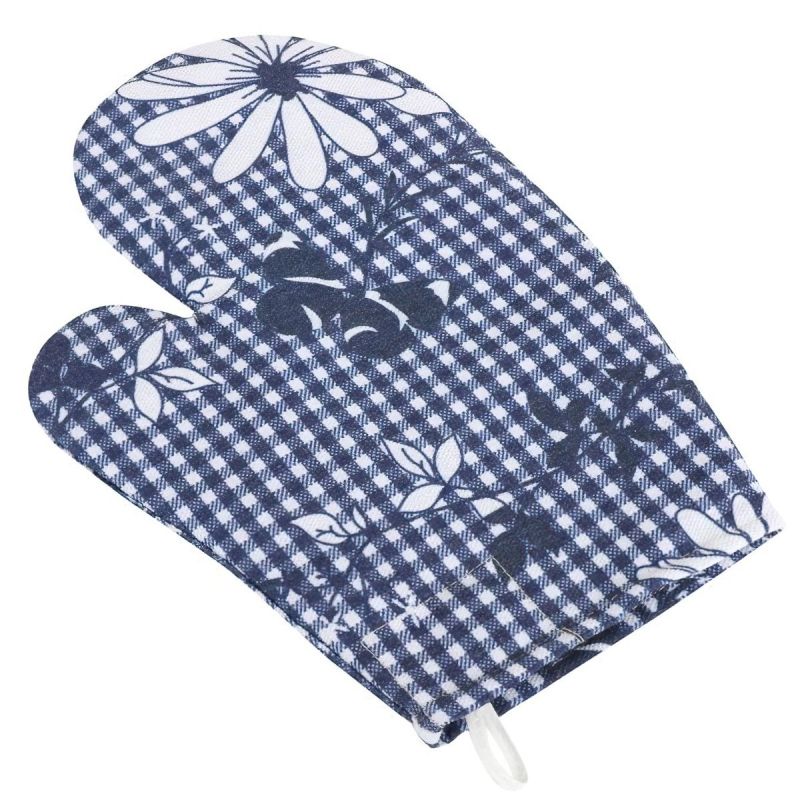 Kuchyňská chňapka (rukavice) s motivem bílého květu na modré kostičce. Chňapka je v rozměru 28x18cm a je vyrobena z kombinace 90% bavlny a 10% polyesteru. Výplň je z netkané textilie. Chňapka má magnet i poutko na zavěšení a díky své tloušťce dostatečně ochrání před horkými hrnci a předměty.