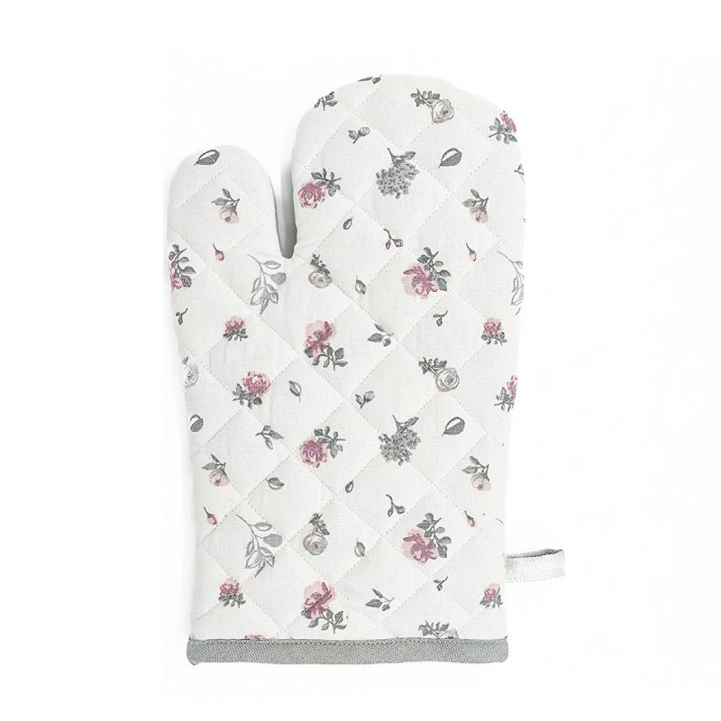 Kuchyňská rukavice s motivem růžovo-šedých kytiček na bílém pozadí. Chňapka je v rozměru 28x18cm a je vyrobena ze 100% bavlny s výplní ze 100% polyesteru (rouno z dutého vlákna).