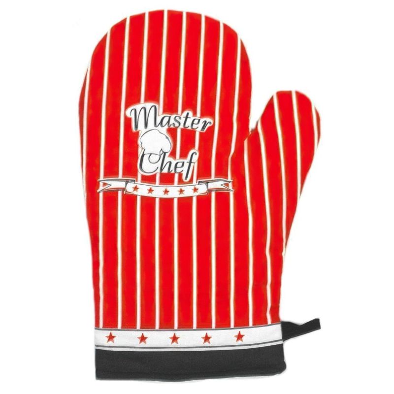 Kuchyňská chňapka (rukavice) s kuchařským oboustranným vzorem s nápisem Master Chef a proužky v červeném provedení. Chňapka má všitý magnet a poutko na zavěšení. Chňapka je v rozměru 28x18cm a je vyrobena ze 100% bavlny s výplní ze 100% polyesteru (rouno z dutého vlákna).