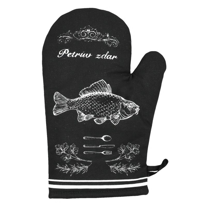 Kuchyňská chňapka (rukavice) se vzorem ryby a nápisu Petrův zdar v černém provedení. Chňapka má všitý magnet a poutko na zavěšení. Chňapka je v rozměru 28x18cm a je vyrobena ze 100% bavlny s výplní ze 100% polyesteru (rouno z dutého vlákna).