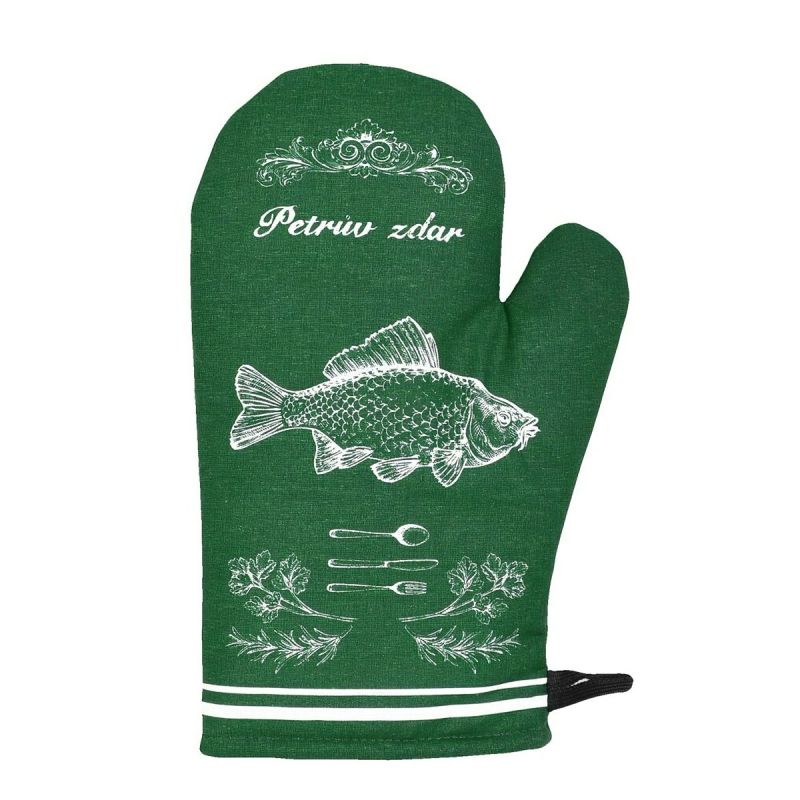 Kuchyňská chňapka (rukavice) se vzorem ryby a nápisu Petrův zdar v zeleném provedení. Chňapka má všitý magnet a poutko na zavěšení. Chňapka je v rozmě...