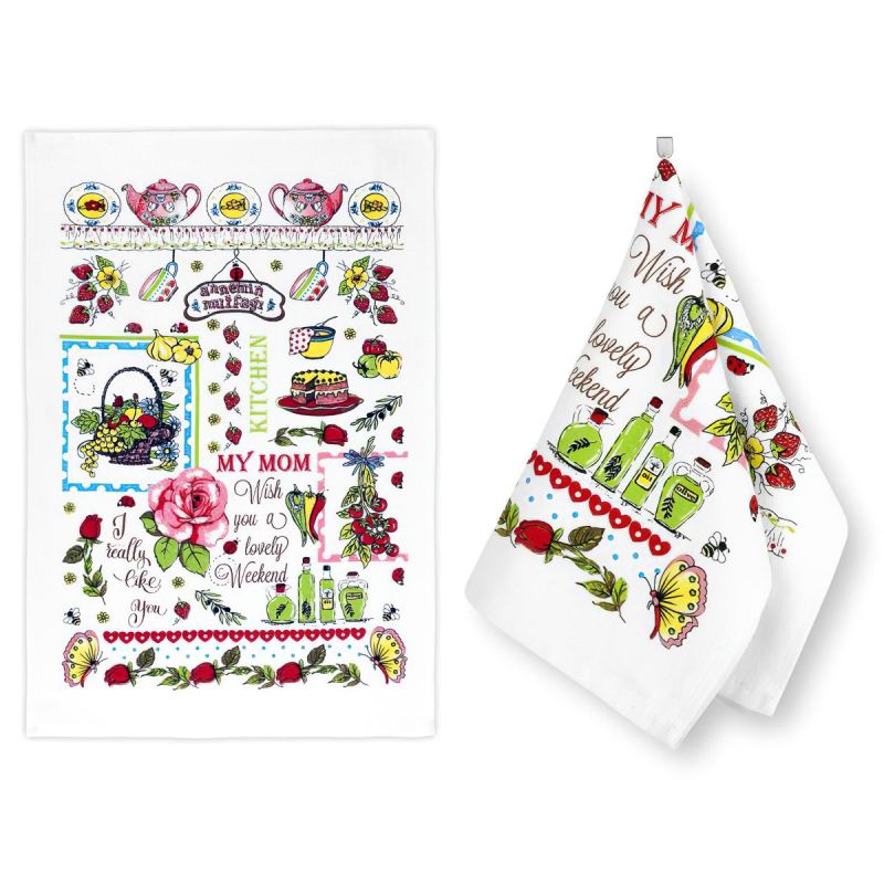 Froté kuchyňská utěrka ze 100% bavlny (gramáž 350g/m2) v rozměru 40x60cm se vzorem růže a kuchyňských potřeb na bílém podkladu. Utěrka je z lícové str...