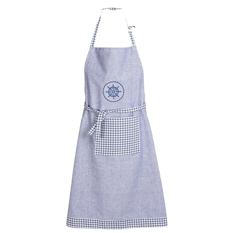 Kuchyňská zástěra je vyrobena ze 100% bavlny v rozměru 70x90 cm se vzorem kára a kruhu s kormidlem v modré barvě.