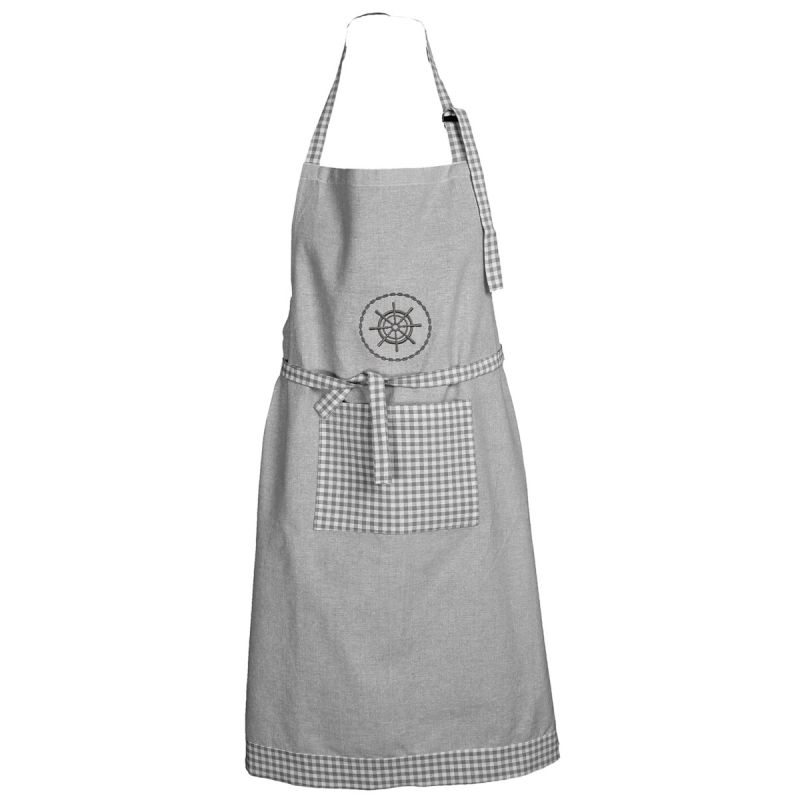 Kuchyňská zástěra je vyrobena ze 100% bavlny v rozměru 70x90 cm se vzorem kára a kruhu s kormidlem v šedé barvě.