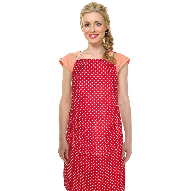 Kuchyňská zástěra vyrobená v kombinaci 70 % bavlna, 30 % polyester se vzorem bílých puntíků na červeném podkladu. Zástěra má rozměr 67x84cm, a je tak vhodná na každou postavu. Opatřena je praktickou velkou kapsou uprostřed.