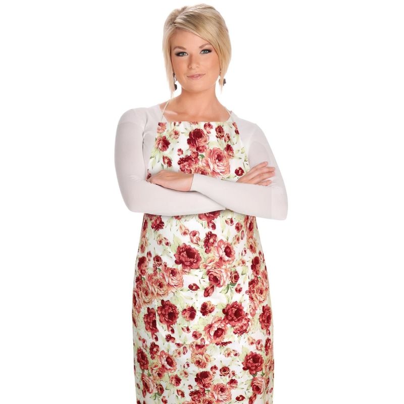Kuchyňská zástěra vyrobená v kombinaci 70 % bavlna, 30 % polyester se vzorem růžových květů pivoněk. Zástěra má rozměr 67x84cm, a je tak vhodná na každou postavu. Opatřena je praktickou velkou kapsou uprostřed.