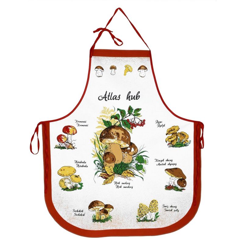 Kuchyňská zástěra je vyrobena ze 100% bavlny v rozměru 63x80 cm s houbařským vzorem atlasu hub v teracotovém provedení.