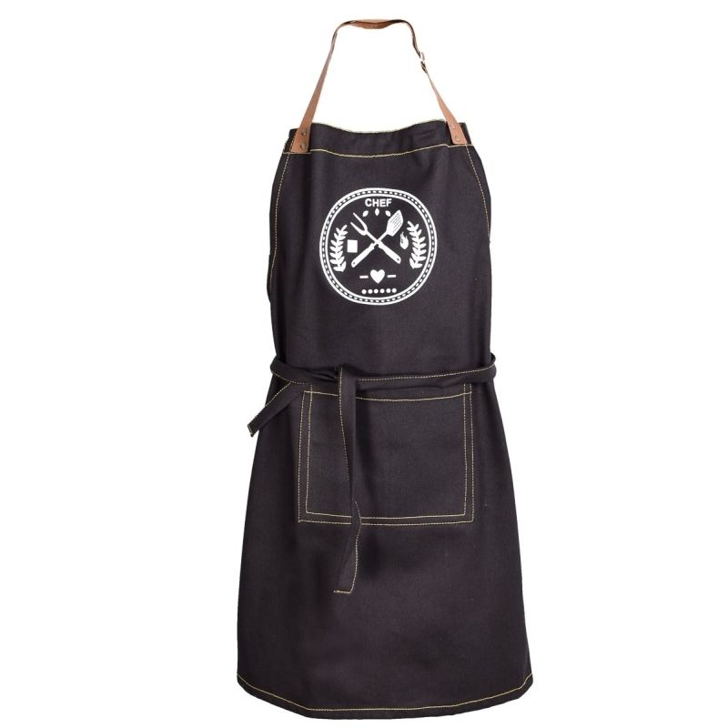 Kuchyňská zástěra v rozměru 70x80 cm se vzorem příboru a nápisu "CHEF" v černé barvě ze 100% bavlněné pevné rifloviny.
