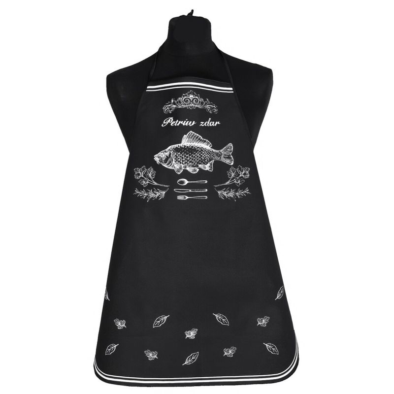 Kuchyňská zástěra je vyrobena ze 100% bavlny v rozměru 63x80 cm se vzorem ryby a nápisem Petrův zdar v černém provedení.