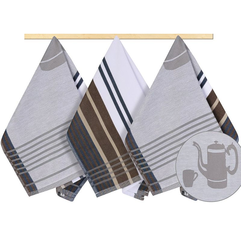 Souprava tří kusů kuchyňských utěrek ze 100% bavlny v rozměru 50x70cm s motivem šedé konvičky na šedém podkladu s hnědými proužky.