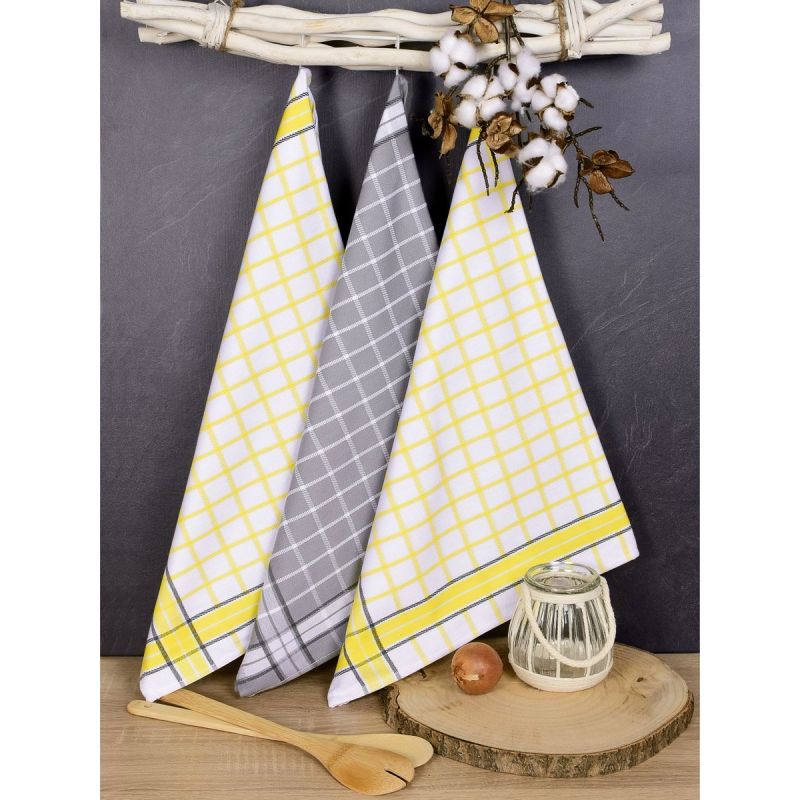 Souprava tří kusů kuchyňských utěrek z exkluzivní egyptské bavlny v rozměru 50x70cm se vzorem kostky ve žluto- šedých barvách. Utěrky z egyptské bavlny jsou vyrobeny z kvalitní bavlněné příze v gramáži 230g/m2.