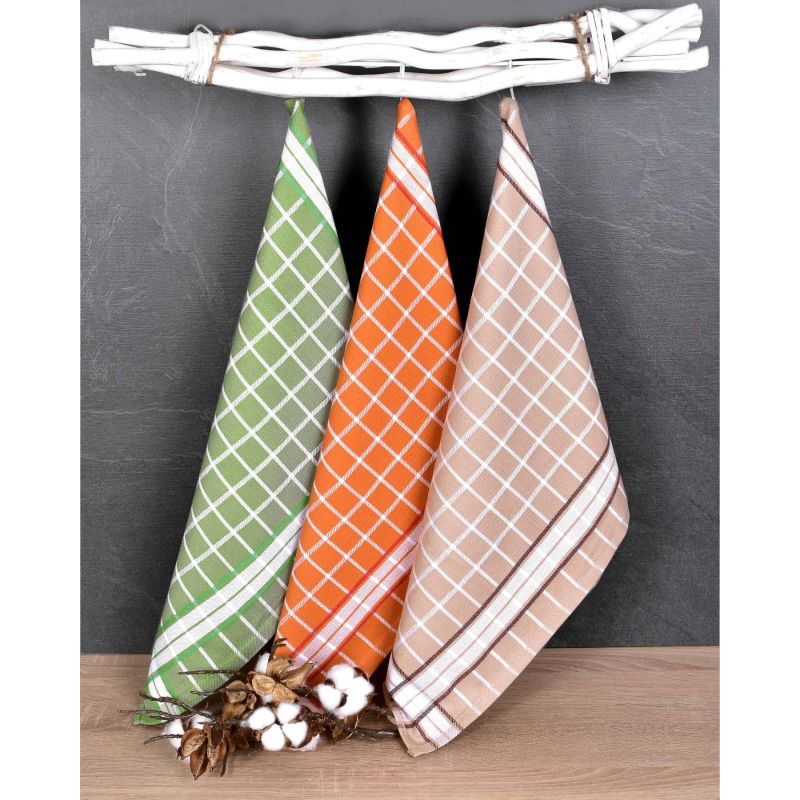 Souprava tří kusů kuchyňských utěrek z exkluzivní egyptské bavlny v rozměru 50x70cm se vzorem oranžové, zelené a béžové kostky. Utěrky z egyptské bavlny jsou vyrobeny z kvalitní bavlněné příze s vysokou gramáží 245g/m2. Balení obsahuje 3 utěrky.