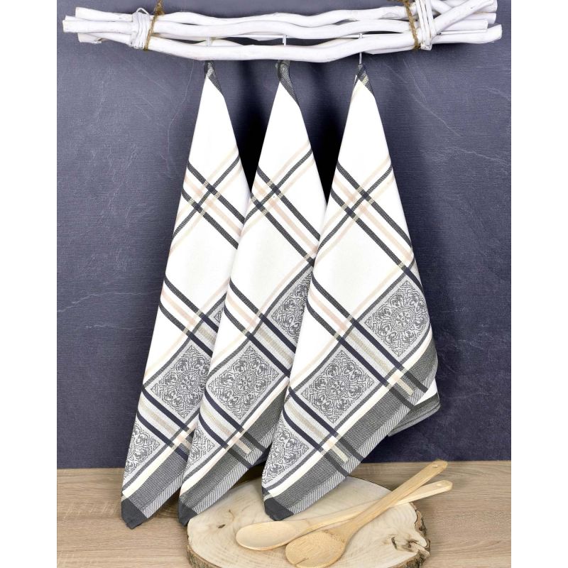 Souprava tří kusů kuchyňských utěrek z exkluzivní egyptské bavlny v rozměru 50x70cm se vzorem šedého kára a ornamentů na bílém podkladu. Utěrky z egyptské bavlny jsou vyrobeny z kvalitní bavlněné příze s vysokou gramáží 245g/m2. Balení obsahuje 3 utěrky.