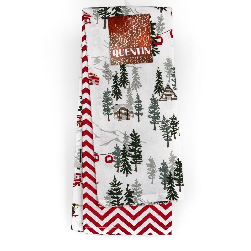 Souprava dvou kusů kuchyňských utěrek z 100% bavlny v rozměru 40x60cm se zimním vzorem. Sada obsahuje 2 utěrky, jednu se vzorem na horách a jednu se vzorem zig-zag (cik cak) v červené barvě.