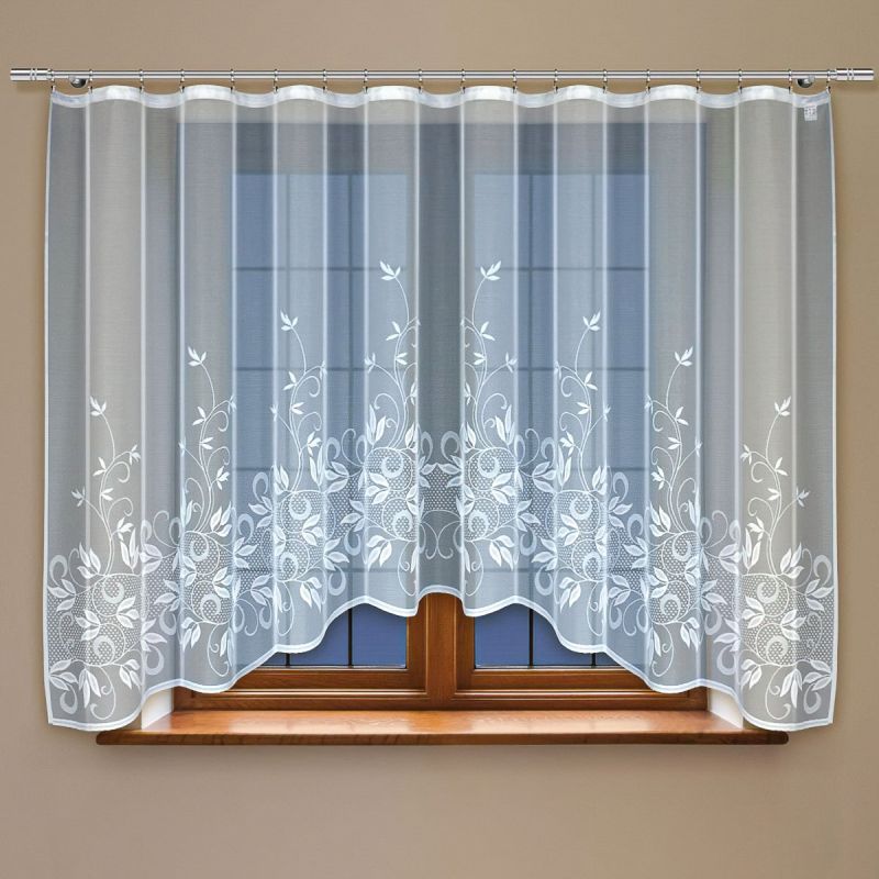 Hotová jemná žakárová záclona se vzorem popínavých květin ve spodní části záclony, které tvoří borduru v jednobarevné bílé barvě. Záclona je vyrobena ze 100% polyesteru v různých výškách a šířkách. Záclona má z výroby pevné boční i horní okraje, s řasící stužkou. Výška záclony je měřena v nejdelším místě.