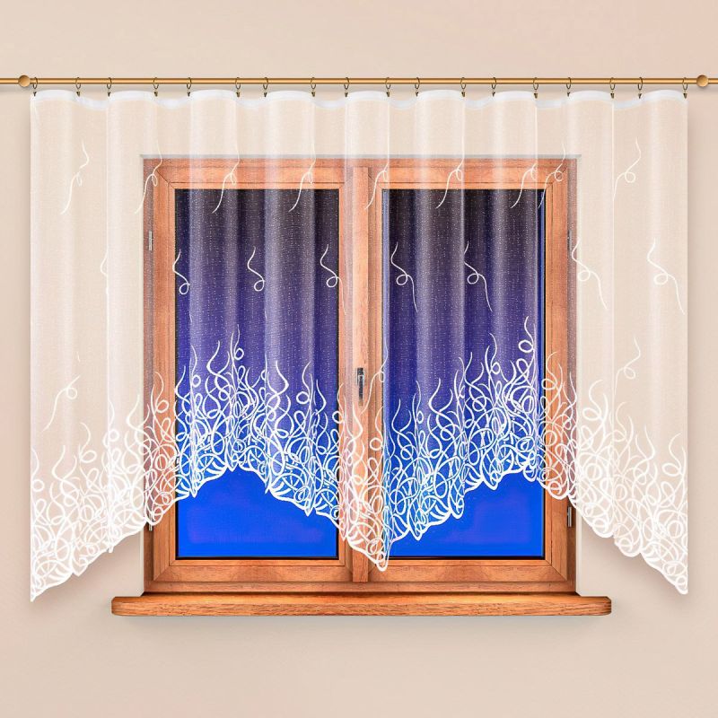 Hotová jemná žakárová záclona se vzorem smyček po celé ploše a ve spodní části záclony tvoří hustou borduru v jednobarevné bílé barvě. Záclona je vyrobena ze 100% polyesteru v různých výškách a šířkách. Záclona má z výroby pevné boční i horní okraje, bez řasící stužky. Výška záclony je měřena v nejdelším místě.