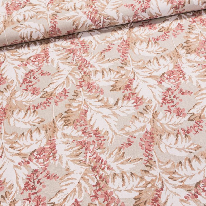 Směsová látka (tkanina) se vzorem listů v béžovo-vínových barvách. Látka je v šířce 140 cm a je vyrobena z 80% bavlny a 20% polyesteru (gramáž 205g/m2...