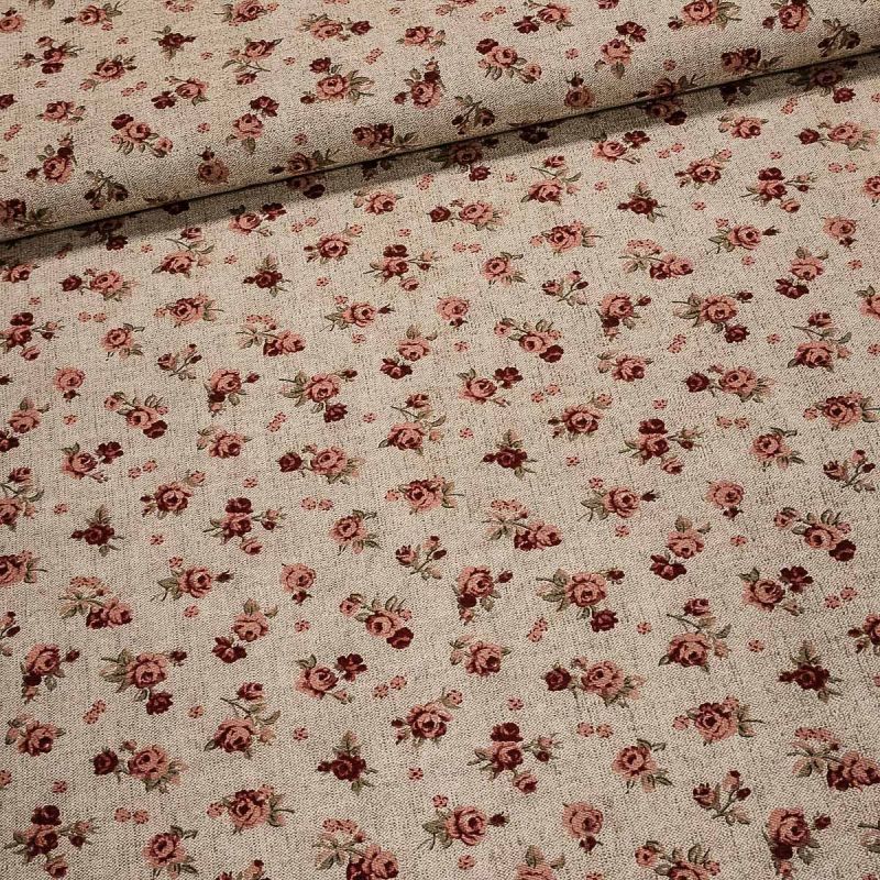 Směsové plátno 2020-44-A růžičky na béžovém melíru, růžová, š.140cm (látka v metráži)