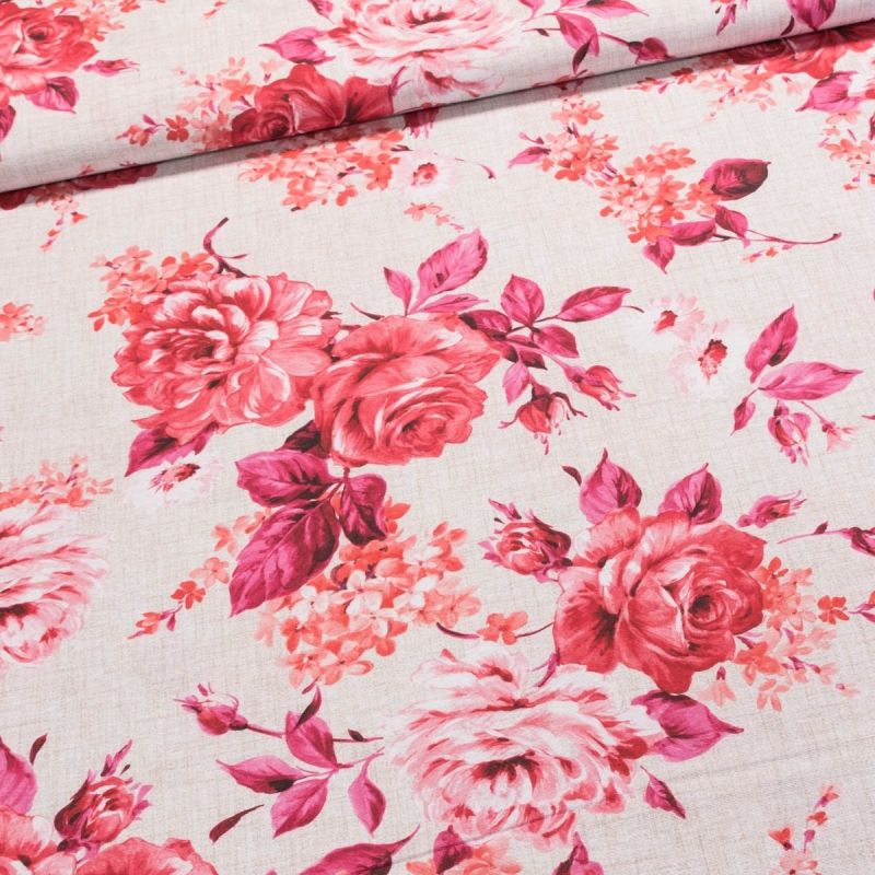 Směsové plátno 303030 MASAVE ČERVENÁ, červené květy na režné, š.140cm (látka v metráži)