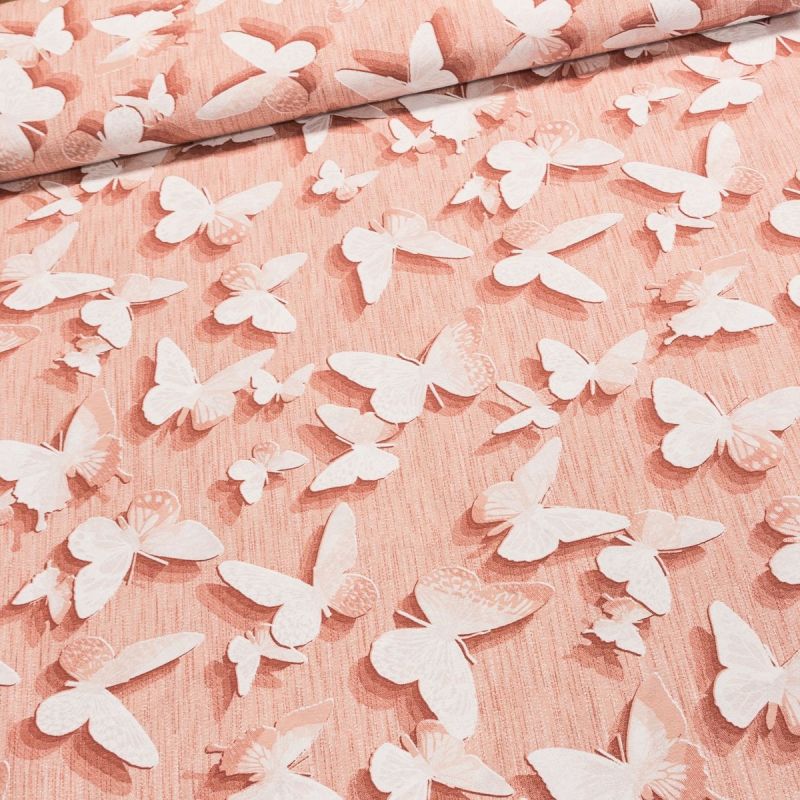 Směsová látka (tkanina) se vzorem bílých motýlů na lososovém podkladu. Látka je v šířce 140 cm a je vyrobena z 55% bavlny a 45% polyesteru. Motiv na látce je pouze z jedné strany, z druhé je látka bez potisku.