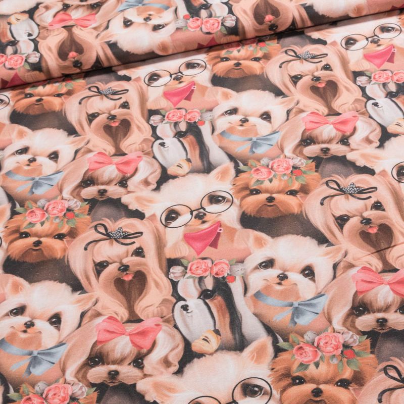 Směsová látka (tkanina) se vzorem roztomilých pejsků v béžových odstínech. Látka je v šířce 140 cm a je vyrobena z 55% bavlny a 45% polyesteru. Motiv na látce je pouze z jedné strany, z druhé je látka bez potisku.